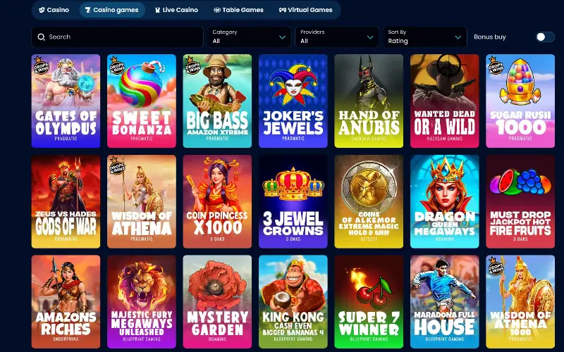 Cu 50 de furnizori disponibili, printre cei mai cunoscuți se numără Pragmatic Play, Hacksaw Gaming și BGaming, care asigură o selecție de jocuri de înaltă calitate și funcții populare.